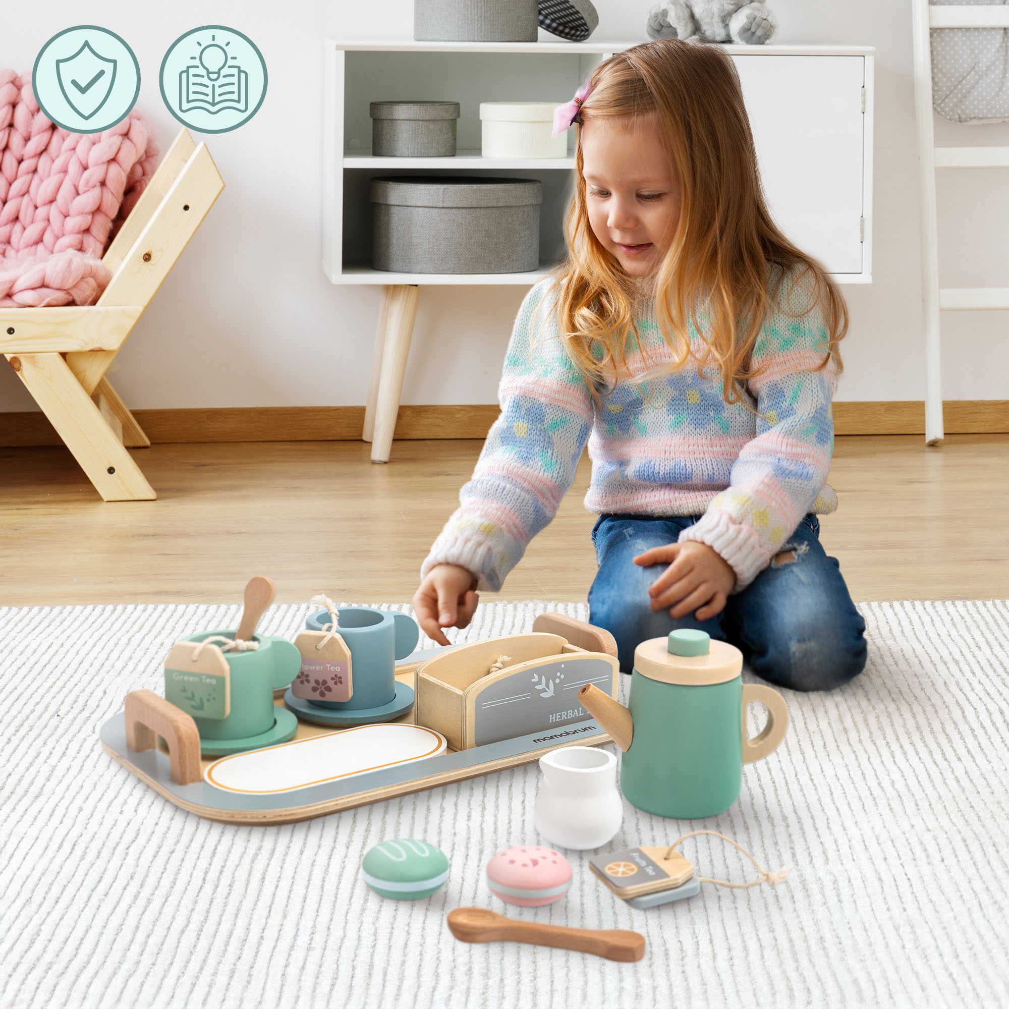 Ezt a készletet olyan gyermekek számára készítettük, akik szeretik megalkotni saját forgatókönyveiket. A tea főzése, a csészék elrendezése és a történetek kitalálása minden játékidőt egy kis kalanddá változtat.