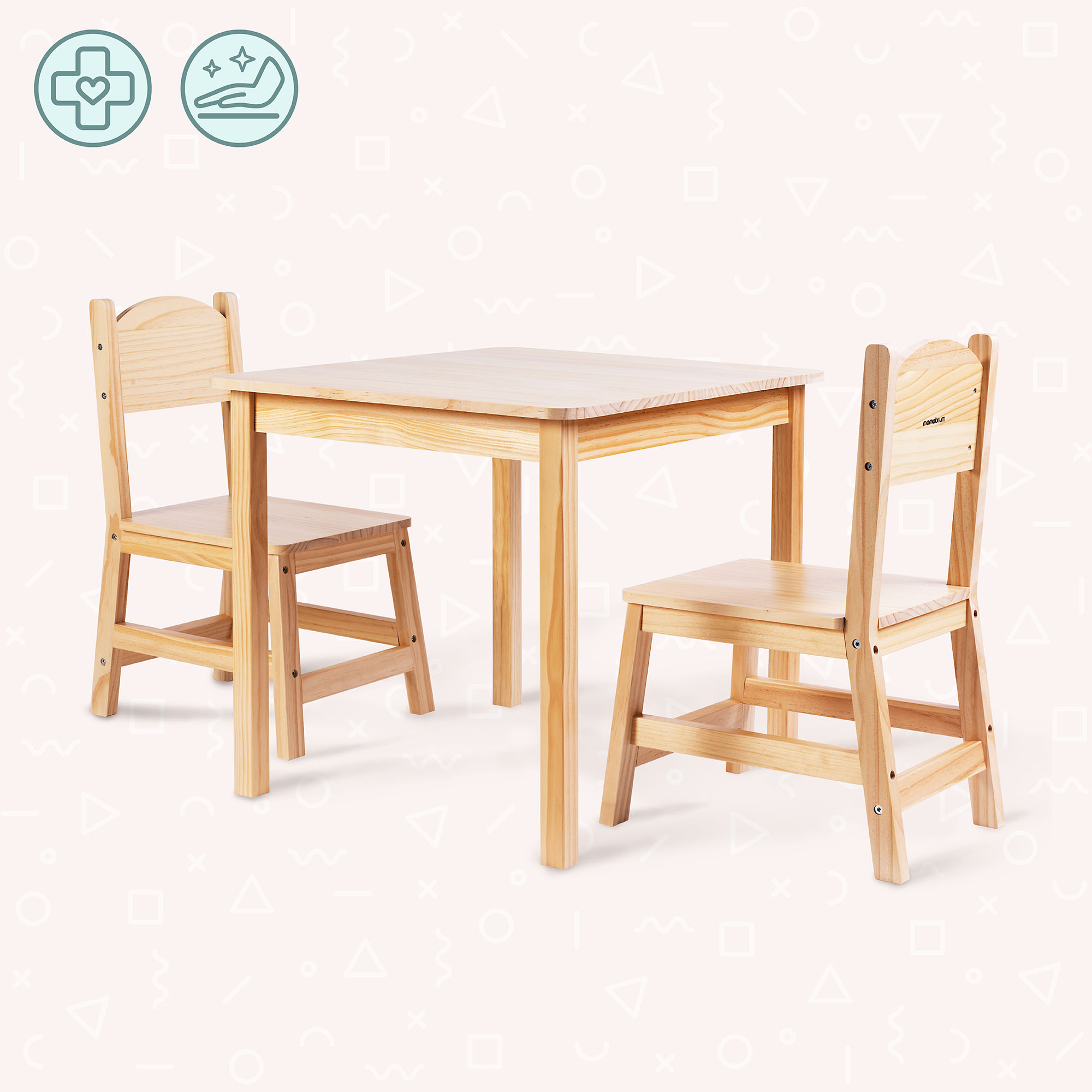 Adj gyermekednek saját teret! – biztonságos, kényelmes és tele lehetőségekkel. Ez a fa bútor szett egy asztallal és két székkel tökéletes helyet teremt rajzoláshoz, rejtvényfejtéshez, tanuláshoz, étkezéshez, vagy a testvérekkel és barátokkal való játékhoz. A természetes fenyőfa, az ergonomikus forma és a masszív szerkezet tökéletes kiegészítője ennek a bútornak a gyerekszobában, a nappaliban vagy a játszótéren.