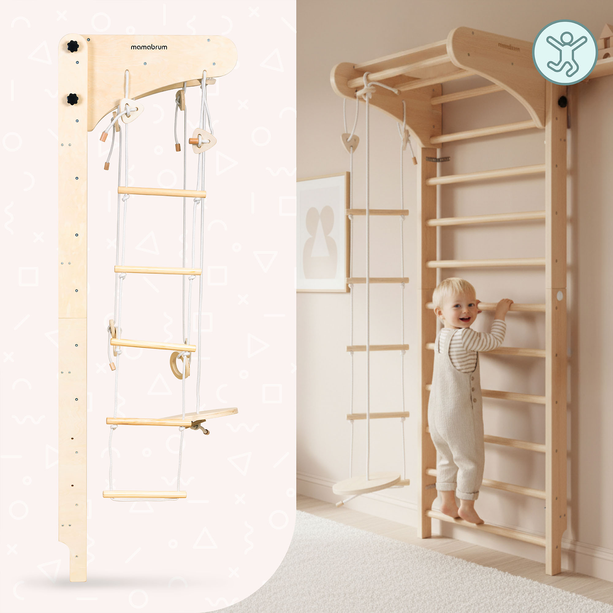 Nem kell aggódnod az eső, a tél vagy az időhiány miatt, ha a játszótérre szeretnél menni . A Mamabrum torna falrúd garantálja a napi testmozgást otthon – időjárástól függetlenül. A kicsi mászhat, hintázhat a libikókán, gyakorolhatja az egyensúlyát a tornakarikákon, vagy javíthatja a koordinációt a kötéllétrán – amikor csak kedve tartja . Nagyszerű megoldás mind a rövid játékidőre napközben, mind a hosszabb aktivitásra a szabad délutánokon. Ez lehetővé teszi gyermeked számára, hogy leadja az energiáját, megmozgassa az egész testét, és egészséges testmozgási szokásokat tartson fenn az időjárástól függetlenül.