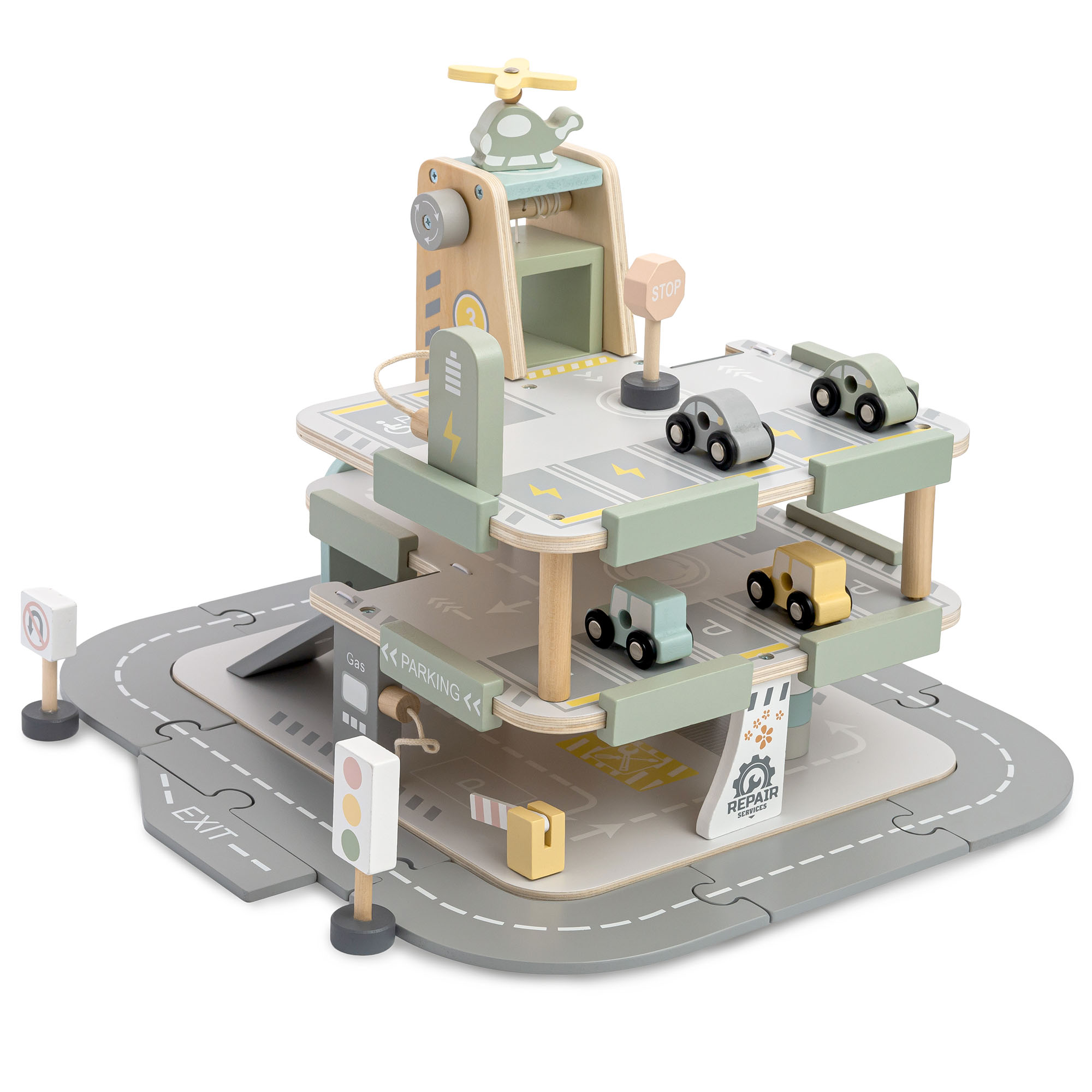 Fából készült, háromszintes garázs gyerekeknek kiegészítőkkel - parkoló, benzinkút, autómosó, helikopter