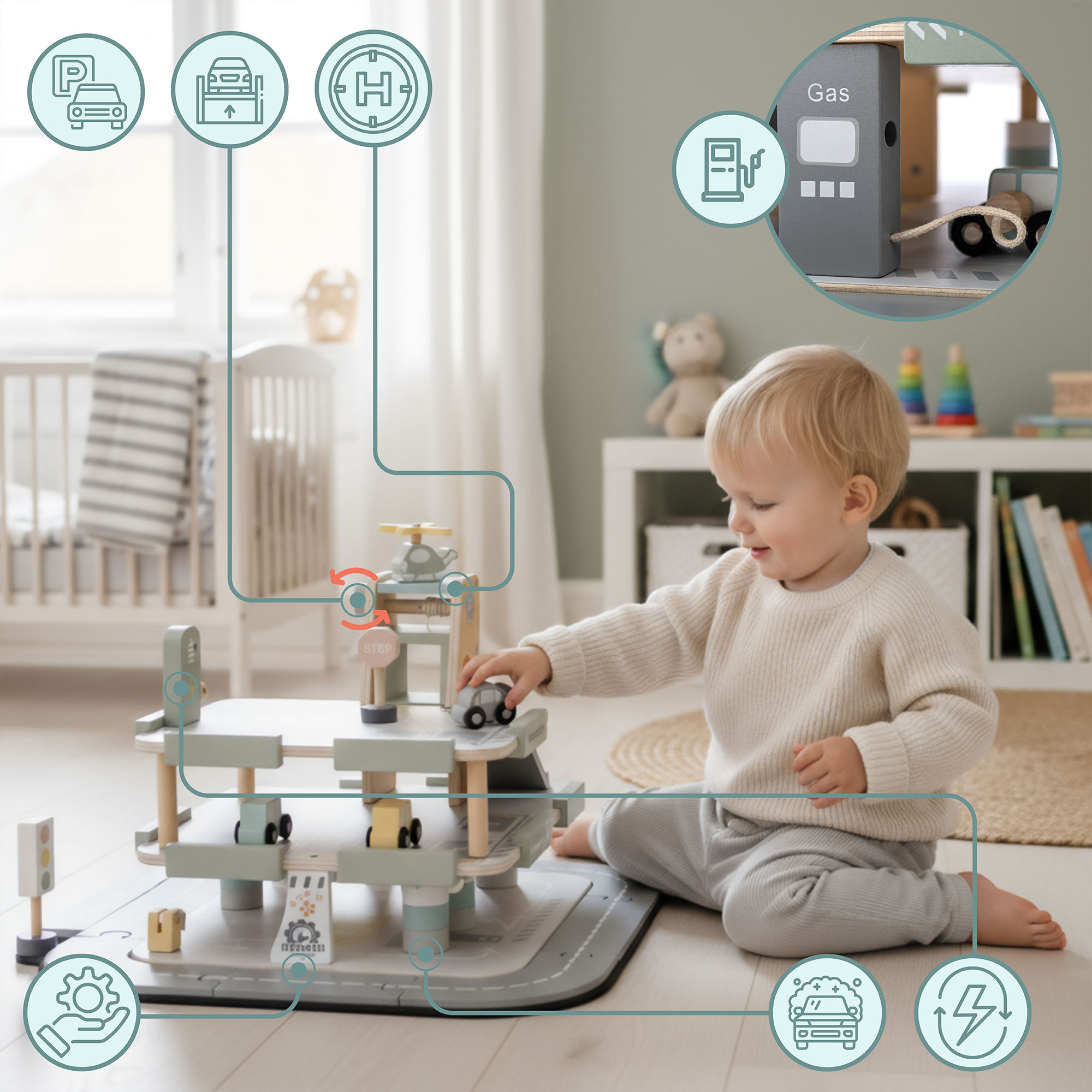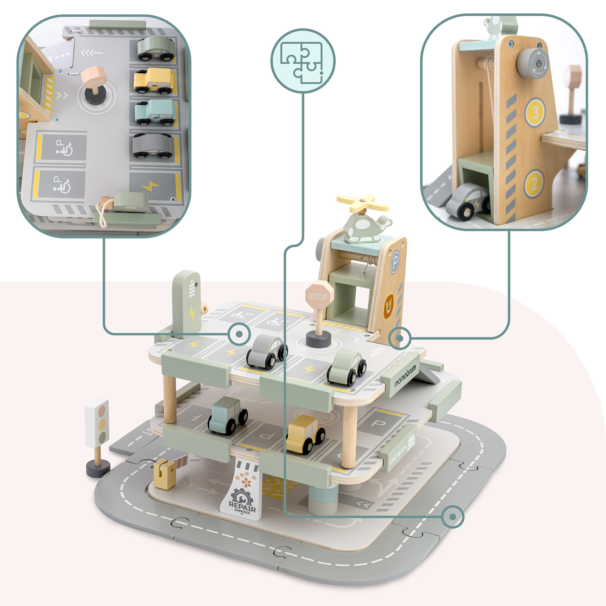 Adj a kicsinek saját autós központot! A háromszintes, fából készült Mamabrum garázs nem csupán egy parkoló , hanem benzinkutat, autómosót, javítóműhelyt, elektromos töltőpontot, mobil autóemelőt és helikopter-leszállópályát is tartalmaz . A kiegészítők széles választékával a gyerekek számtalan játékhelyzetet alkothatnak – a mindennapi utazásoktól az izgalmas városi kalandokig.