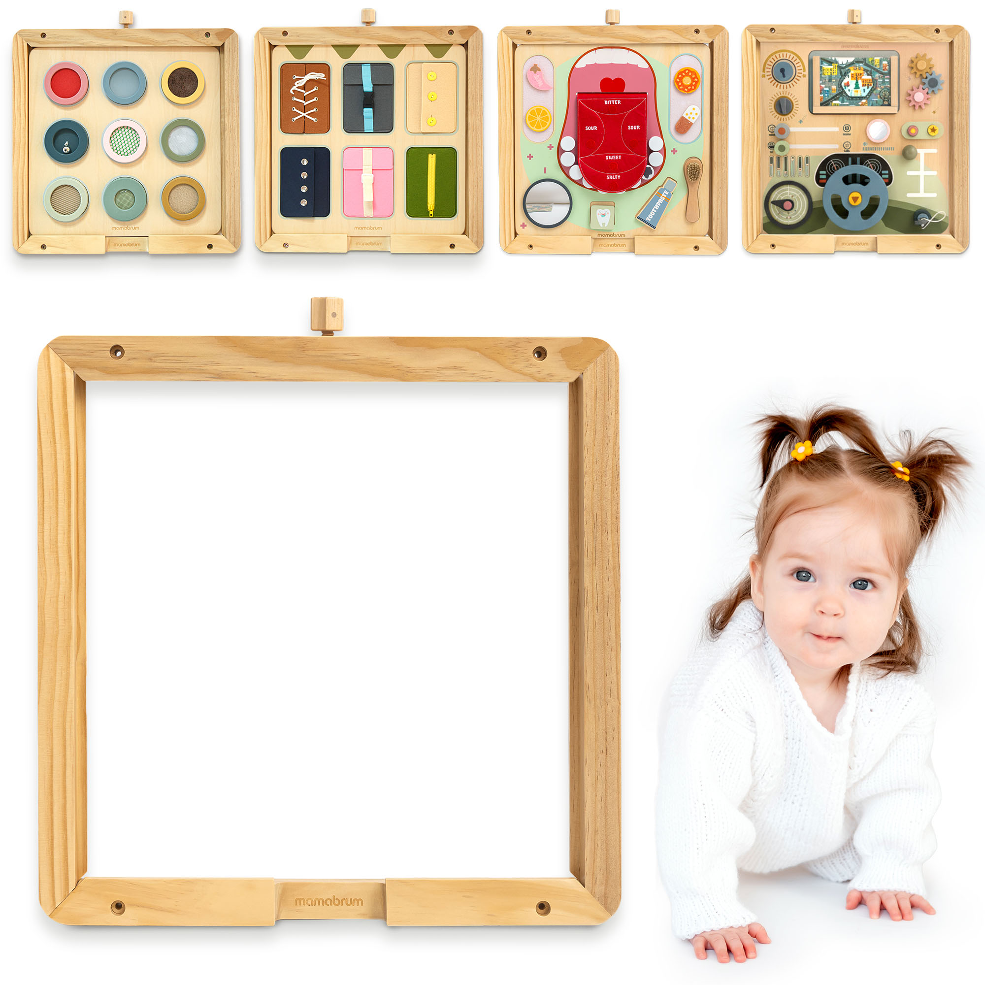 A fa rögzítőkeretnek köszönhetően bármely oktatótábla egyedi, függő játszótérré válhat. Falra szerelve stabil marad és mindig készen áll az új tevékenységekre. A gyerekek könnyen hozzáférhetnek, szabadon mozgathatják az elemeket, formákat párosíthatnak és gyakorolhatják kézügyességet – mindezt biztonságos, ergonomikus helyzetben. Ez a tökéletes megoldás, amely egy átlagos falat inspiráló térré alakít a tanuláshoz, a fejlődéshez és a kreatív játékhoz minden nap.