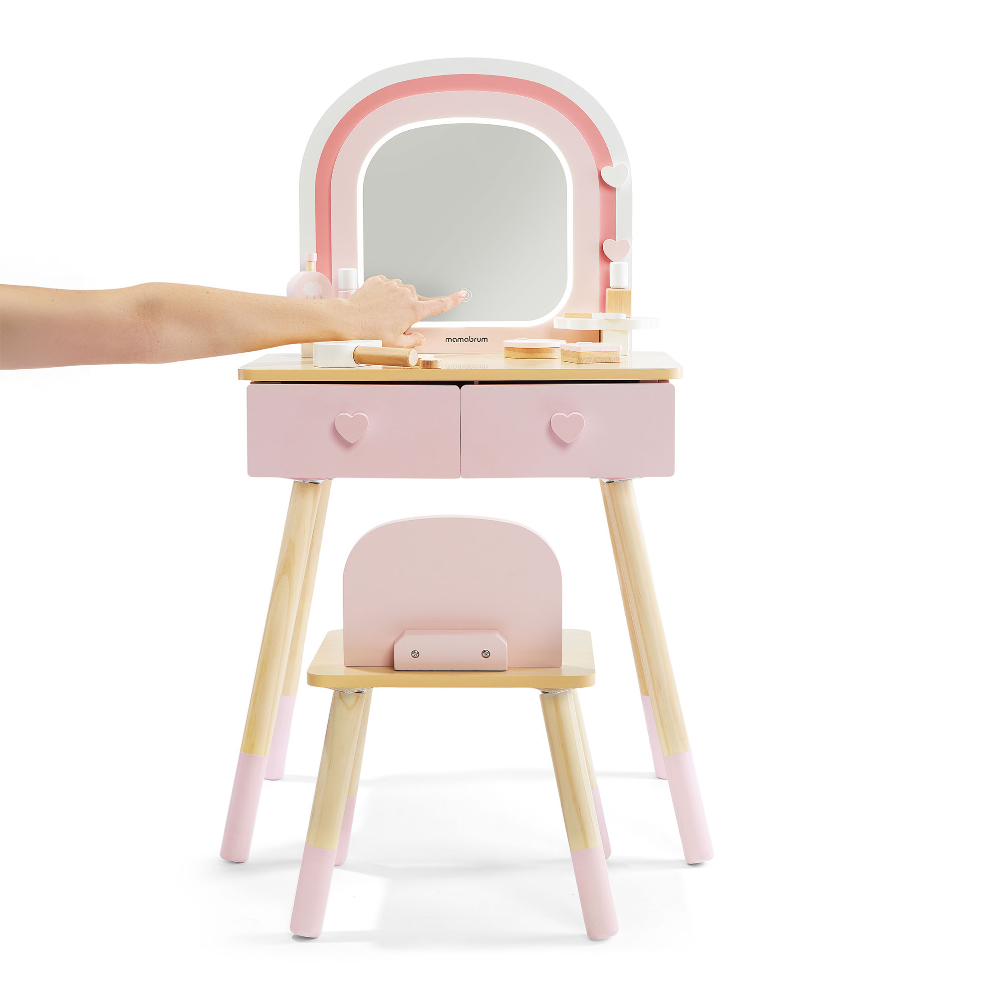 A fésülködőasztal tükröt egyenletes LED-fény veszi körül, amely megvilágítja a teret, és kellemes, játékos hangulatot teremt. A világítás a tükrön található érintőgombbal vezérelhető – egyetlen érintés elegendő a lámpa bekapcsolásához és a fényerő több szintre állításához . Ez lehetővé teszi a gyerekek számára, hogy a világítás intenzitását az igényeiknek megfelelően állítsák be – a lágy esti derengéstől az élénk fényig játékhoz és stílusváltáshoz.