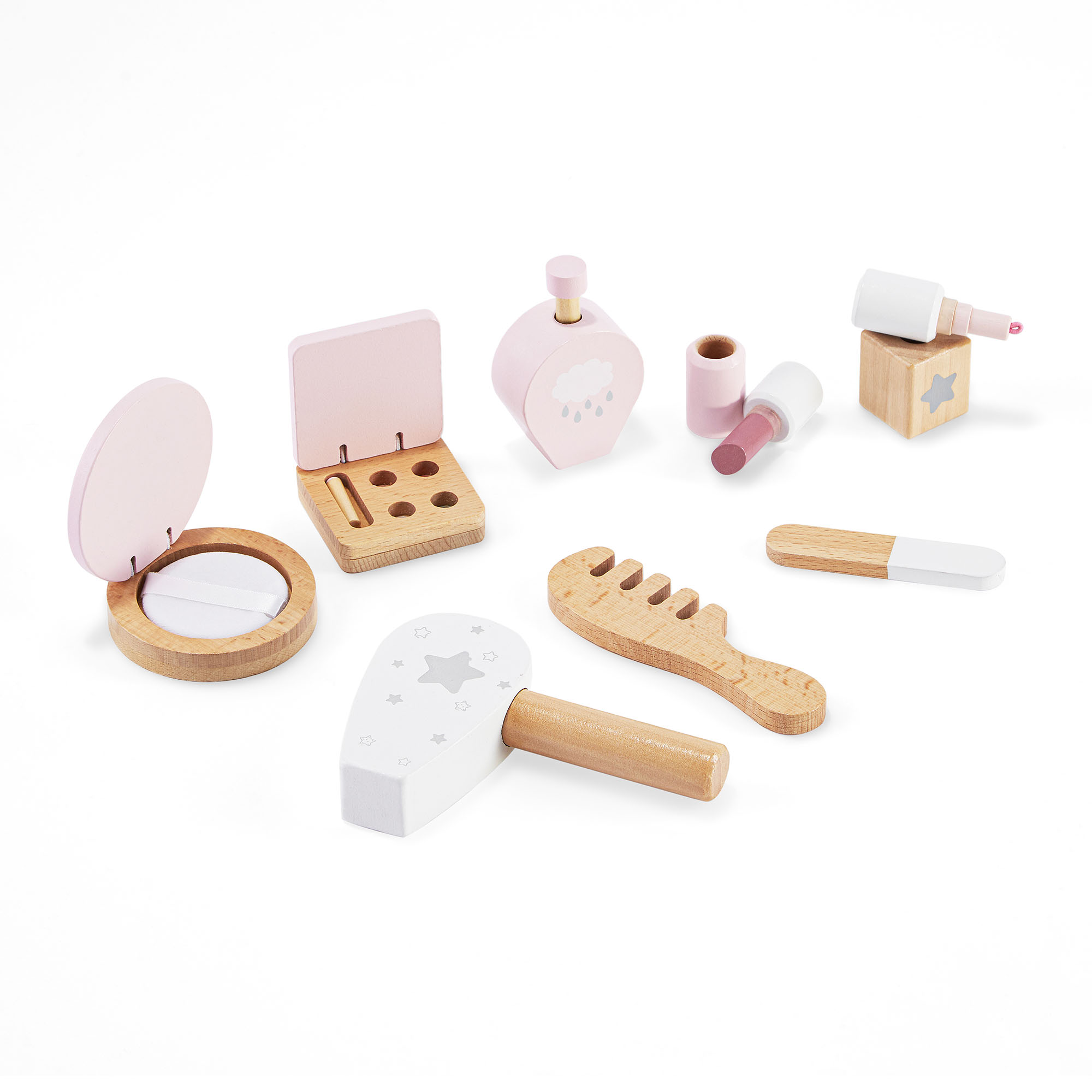 A készlet nyolc fa kozmetikai kiegészítőt tartalmaz, amelyek igazi felnőtt sminkeszközökre hasonlítanak. A készlet tartalmaz egy szemhéjfesték palettát, körömlakkot, parfümöt, púdert, fésűt, hajszárítót, rúzst és körömreszelőt.