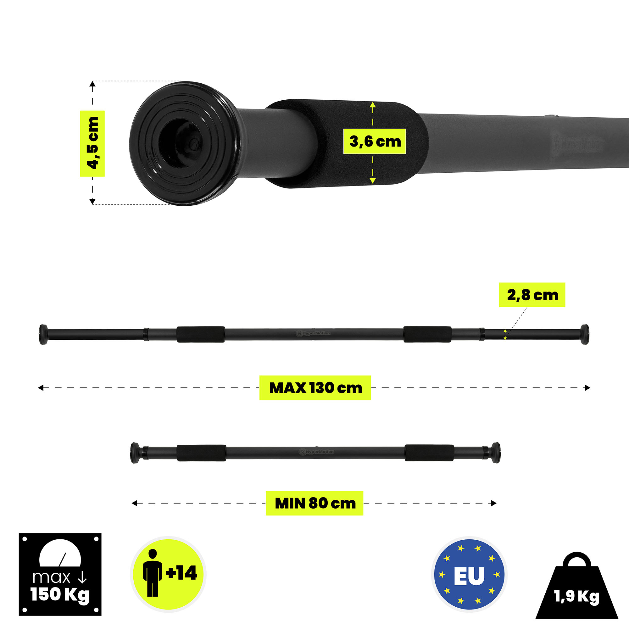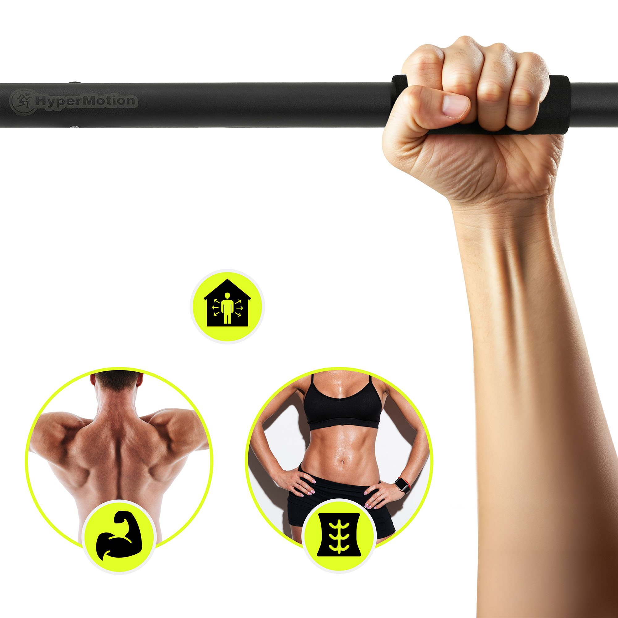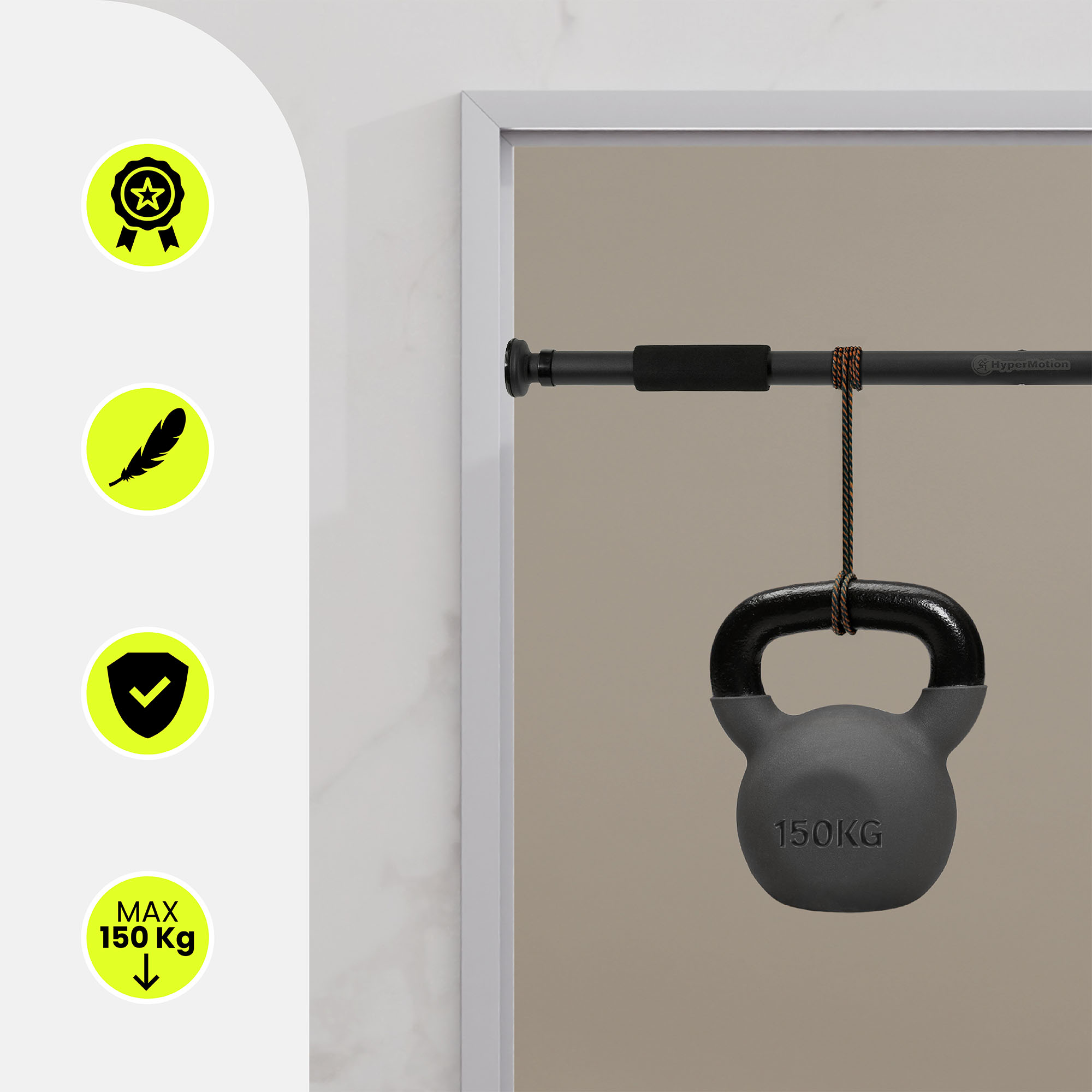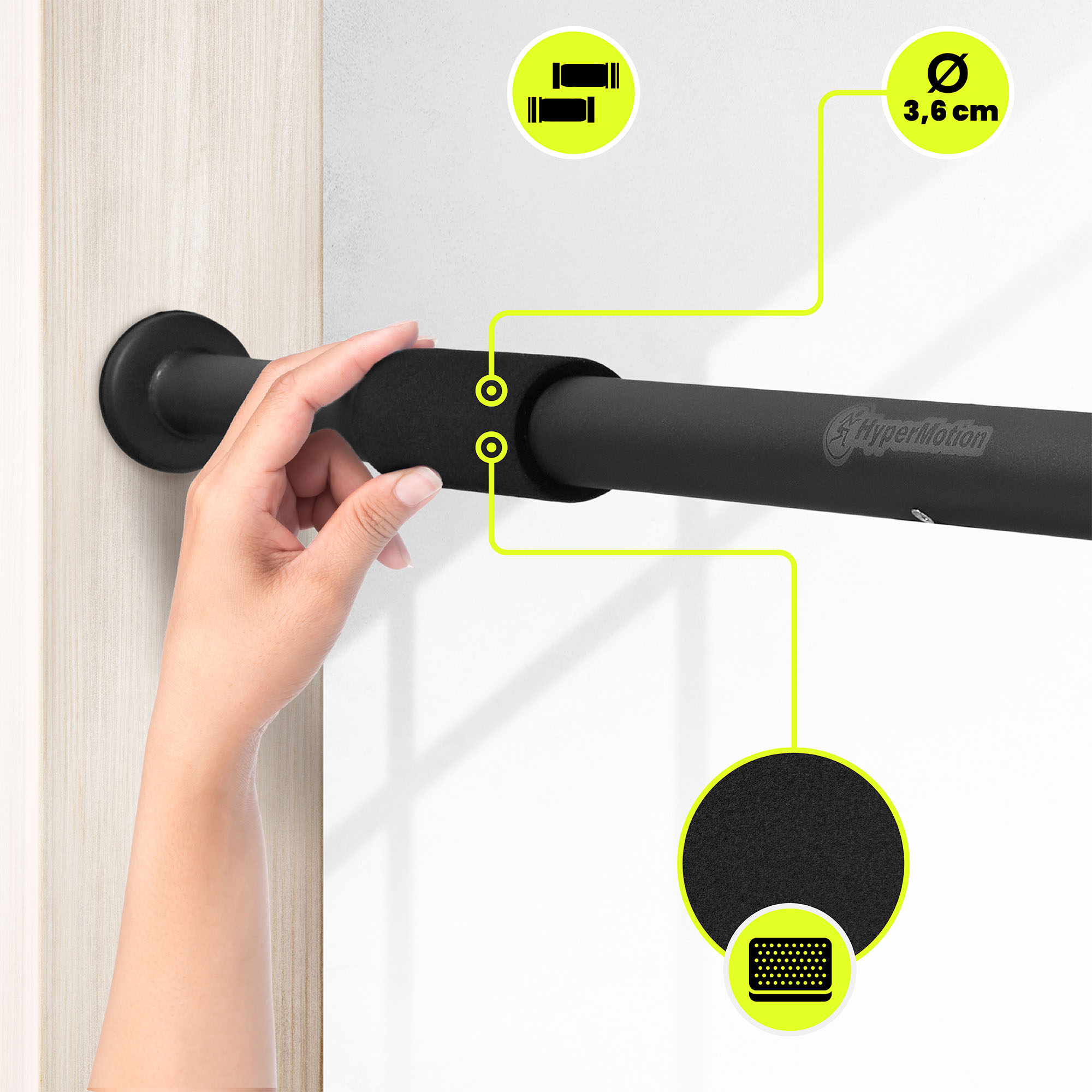 A HyperMotion húzódzkodórúd egy modern, masszív és biztonságos otthoni erőnléti edzőeszköz. Olyan felhasználók számára tervezték, akik erőt szeretnének fejleszteni, izmokat erősíteni és fittséget elérni edzőterem nélkül. 80-130 cm között állítható hosszúságával a legtöbb ajtófélfához illeszkedik, míg fejlett acélszerkezete, védőhabja és csúszásmentes felületei stabilitást, kényelmet és teljes biztonságot biztosítanak edzés közben.