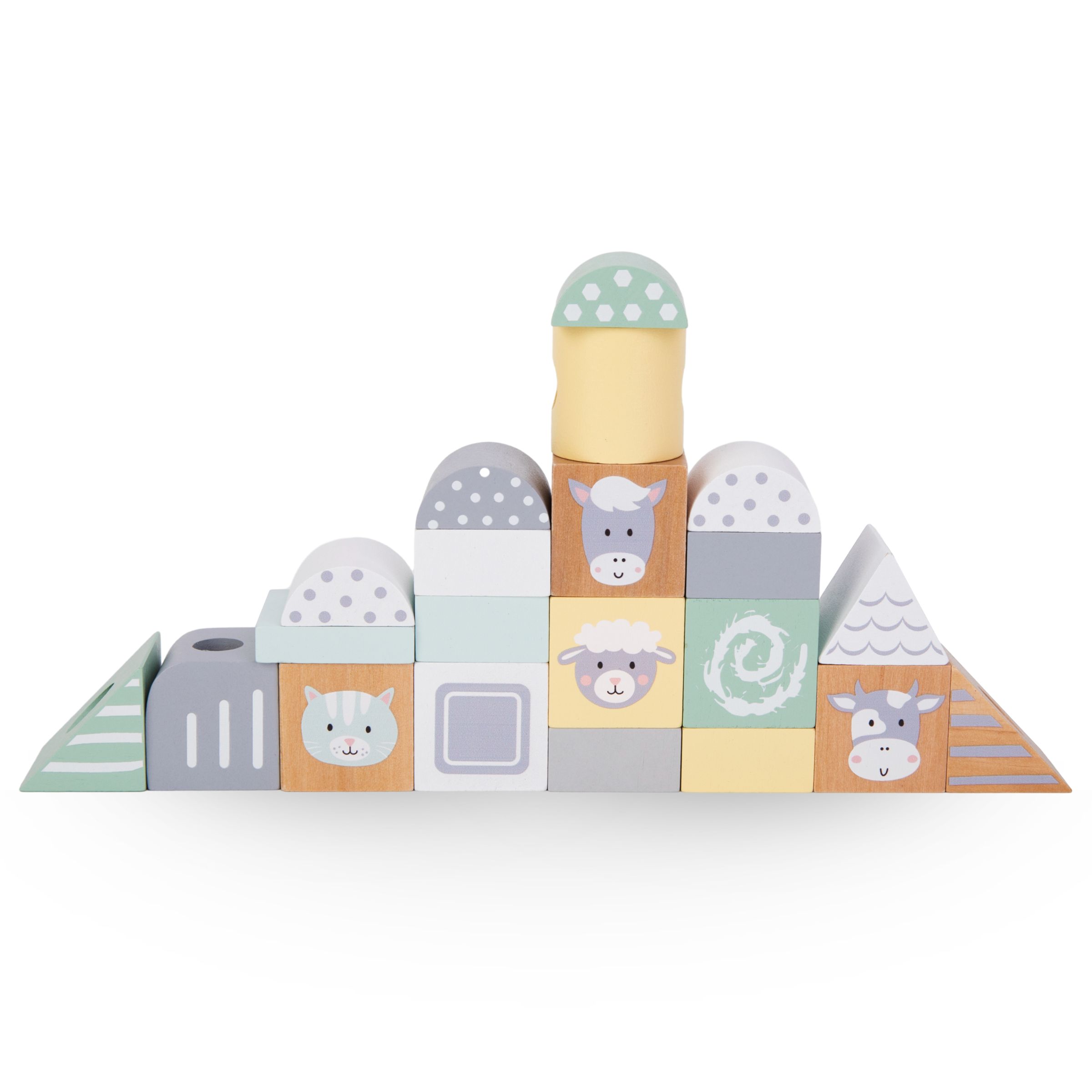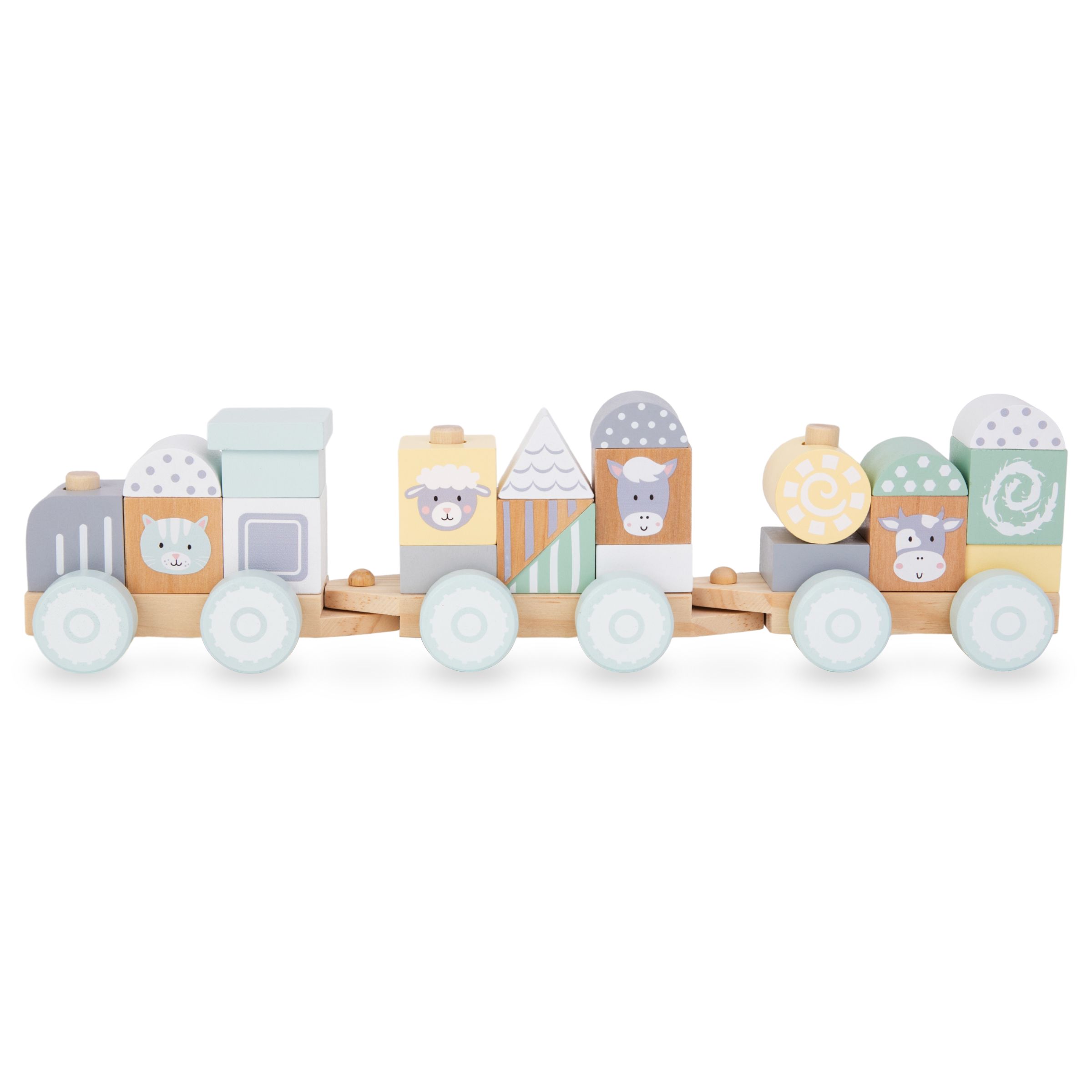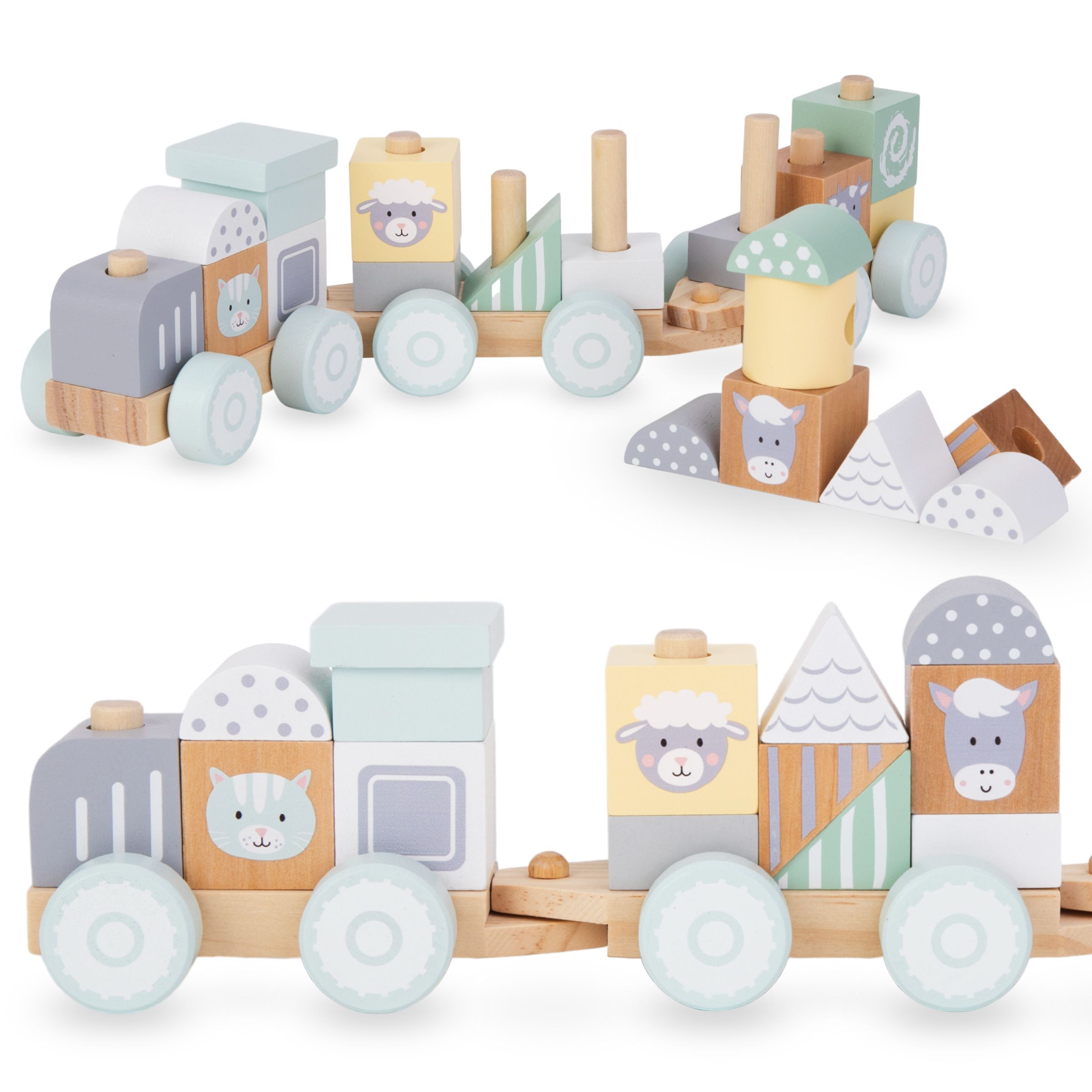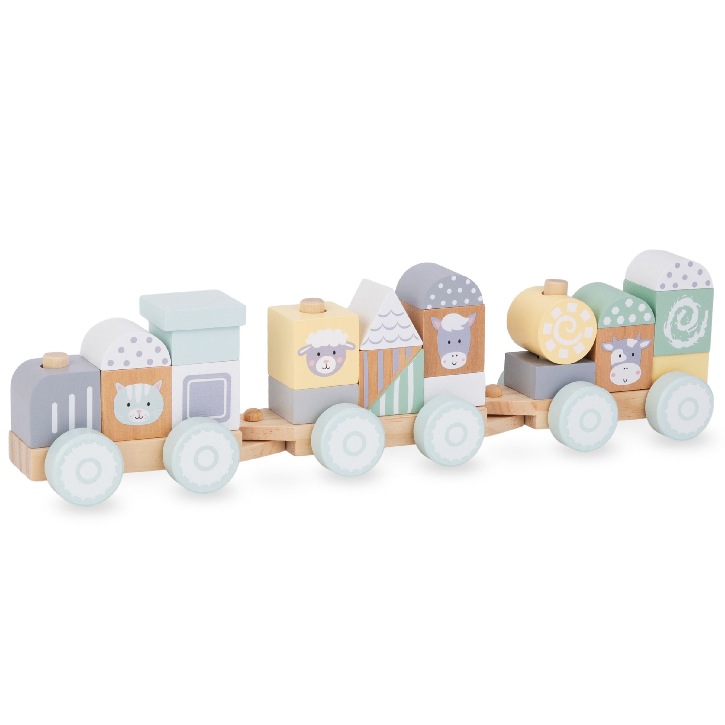 A fából készült, kerekekkel felszerelt kocsik összeilleszthetők, így egy egyedi mozdonyt alkotva. A színes blokkok speciális csapokra való felhelyezésével a kisgyermek egyedi vonatszerkezetet épít. A vonat minden alkalommal másképp nézhet ki! Amikor minden elkészült, ideje elindulni. Az utazás során a kisgyermek leválaszthatja a kocsikat, vagy megváltoztathatja a blokkok helyzetét. A játék változatosabbá tétele érdekében a készlet aranyos tanyasi állatok képével ellátott téglákat tartalmaz.